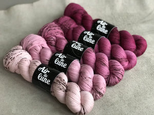 Un kit de 5 écheveaux dans un dégradé violine allant du plus clair au plus foncé, ces couleurs sont parsemées de speckles bruns. Chaque écheveau est unique et les couleurs peuvent légèrement varier d'un écheveau à l'autre, c'est aussi ce qui fait la beauté de la teinture à la main. Pour vos projets tricot en général, et particulièrement avec ce type de coloris très nuance, je vous encourage à tricoter en alternant les écheveaux pour ne pas créer d'effets de moirage ou de démarcation disgracieuse .